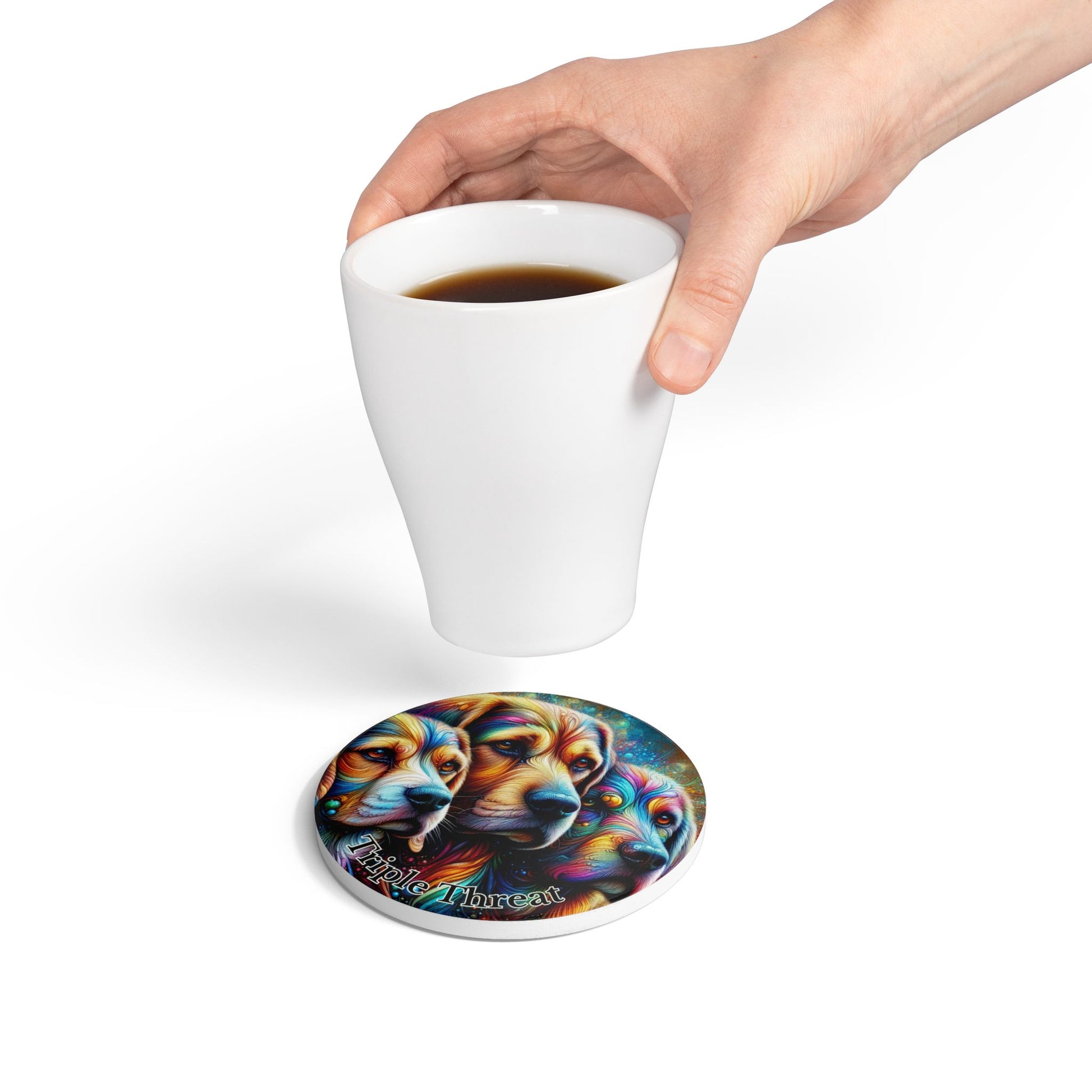 Bright, joyful, and a little bit mischievous — this ceramic coaster brings three dog personalities to your table: a curious Beagle, a playful Labrador, and a stoic Rottweiler rendered in bold, colorful strokes. The smooth white ceramic surface shows off every hue, while the cork backing keeps the coaster steady as you set down a steaming mug or a chilled glass. It lives on morning coffee routines and late-night chats alike, catching rings and small spills without stealing the spotlight from the dogs. For someone who fills their home with canine energy, this coaster adds a splash of art and a wink of humor to everyday moments — a tiny, durable piece of personality under every drink.